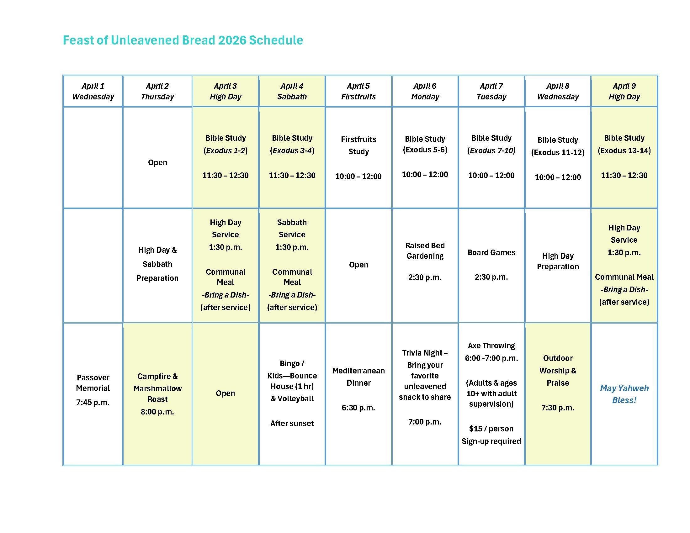 While meals will be the responsibility of individual Feastgoers, there will be several group meals throughout the Feast. Remember that no leavening is permitted at YRM during the Feast of Unleavened Bread.